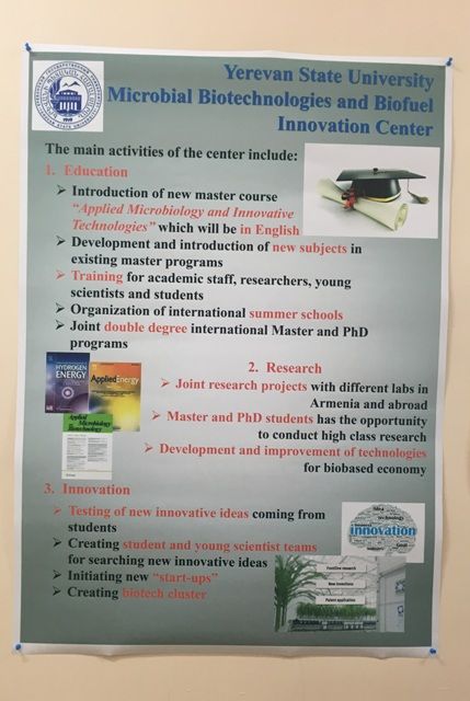 According to YSU Vice-rector on Scientific Policy and International Cooperation GeghamGevorgyan, the center's mission is to build bridges between education, science and production based on the international experience and approaches of education organization and scientific research.The establishment of the center ensures the implementation of the main objective of the program, that is to improve educational, scientific and research and innovation ideas in microbiology and biotechnology, as well as to prepare competitive personnel in accordance with European standards in the fields of microbiology and biotechnology. Furthermore, it is no less important that "Microbial Biotechnology and Biofuel Innovation Center" will also allow to be engaged in entrepreneurial activity,the center's accreditation process can significantly contribute to this.