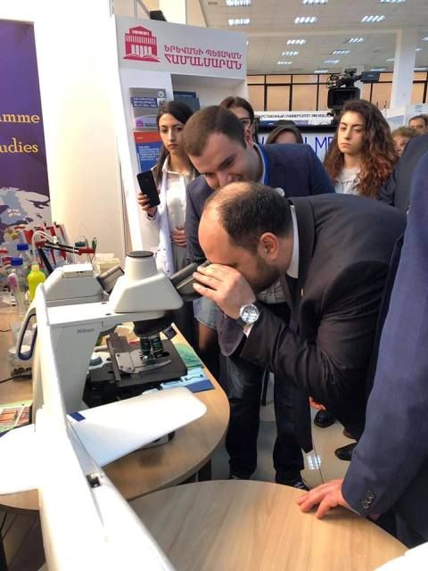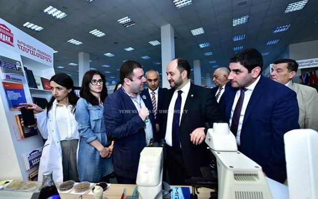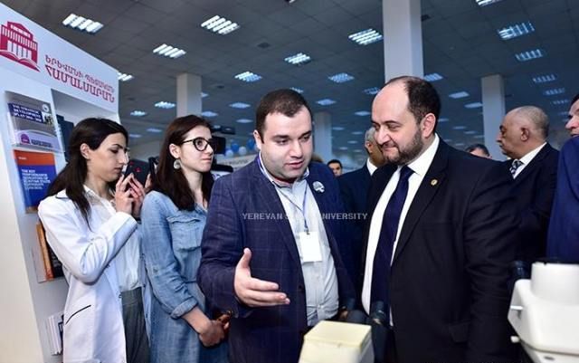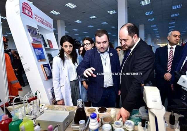 ՀՀ ԿԳ նախարարը մոտեցավ տարբեր կրթական հաստատությունների և կազմակերպությունների տաղավարներին: ԵՊՀ տաղավարում նախարարին մանրամասն ներկայացվեց Կենսաբանության ֆակուլտետում բացված «Մանրէաբանական կենսատեխնոլոգիաների և կենսավառելիքի նորարարական կենտրոն»-ը: Նշենք, որ կենտրոնը ստեղծվել է ՀՀ ԿԳՆ Կրթական ծրագրերի կենտրոն ԾԻԳ-ի կողմից իրականացվող «Կրթության բարելավում» վարկային ծրագրի շրջանակներում` Նորարարությունների մրցակցային հիմնադրամի դրամաշնորհով` Հայաստանի կառավարության և Համաշխարհային բանկի համաֆինանսավորմամբ: Կենտրոնի ղեկավար Կ. Թռչունյանը ՀՀ ԿԳ նախարարին ներկայացրեց դրամաշնորհային ծրագրի արդյունքում ձեռք բերված ժամանակակից սարքավորումների միջոցով արդեն իսկ իրականացվող գիտահետազոտական աշխատանքները: