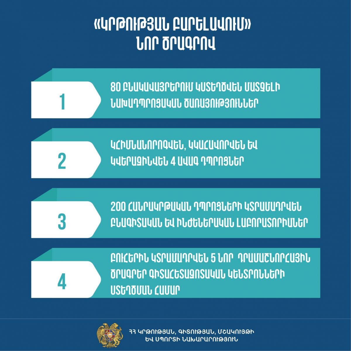 4) Հանրակրթության բարելավմանը` դպրոցներին կրթական ռեսուրսներով և լաբորատոր սարքավորումներով ապահովելու միջոցով: Մասնավորապես 200 հանրակրթական դպրոցների կտրամադրվեն բնագիտական և ինժեներական լաբորատորիաներ, ունենալով ուսումնական գործընթացում լաբորատոր սարքավորումների կիրառման ուղղությամբ վերապատրաստված 1000 ուսուցիչ: